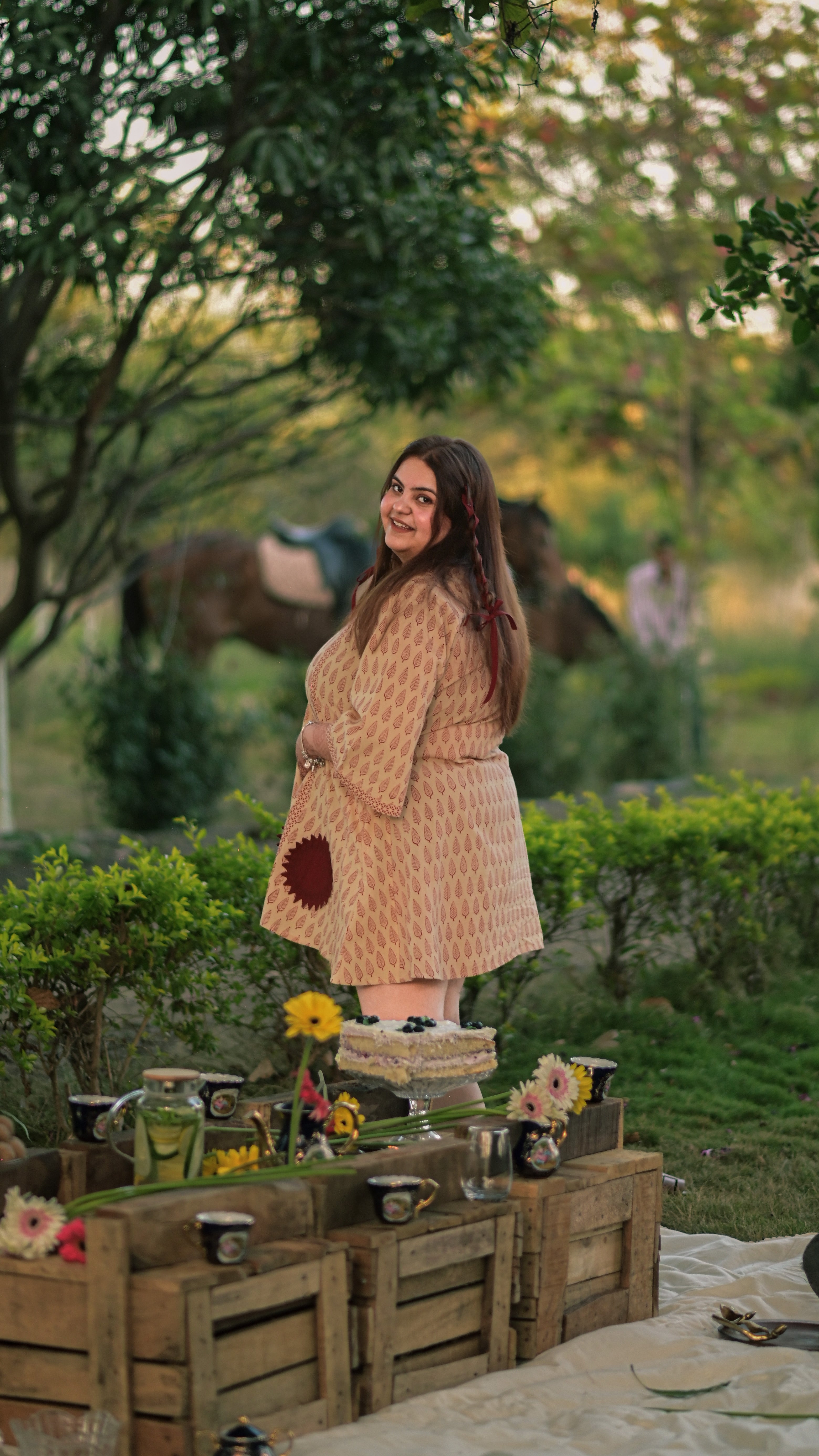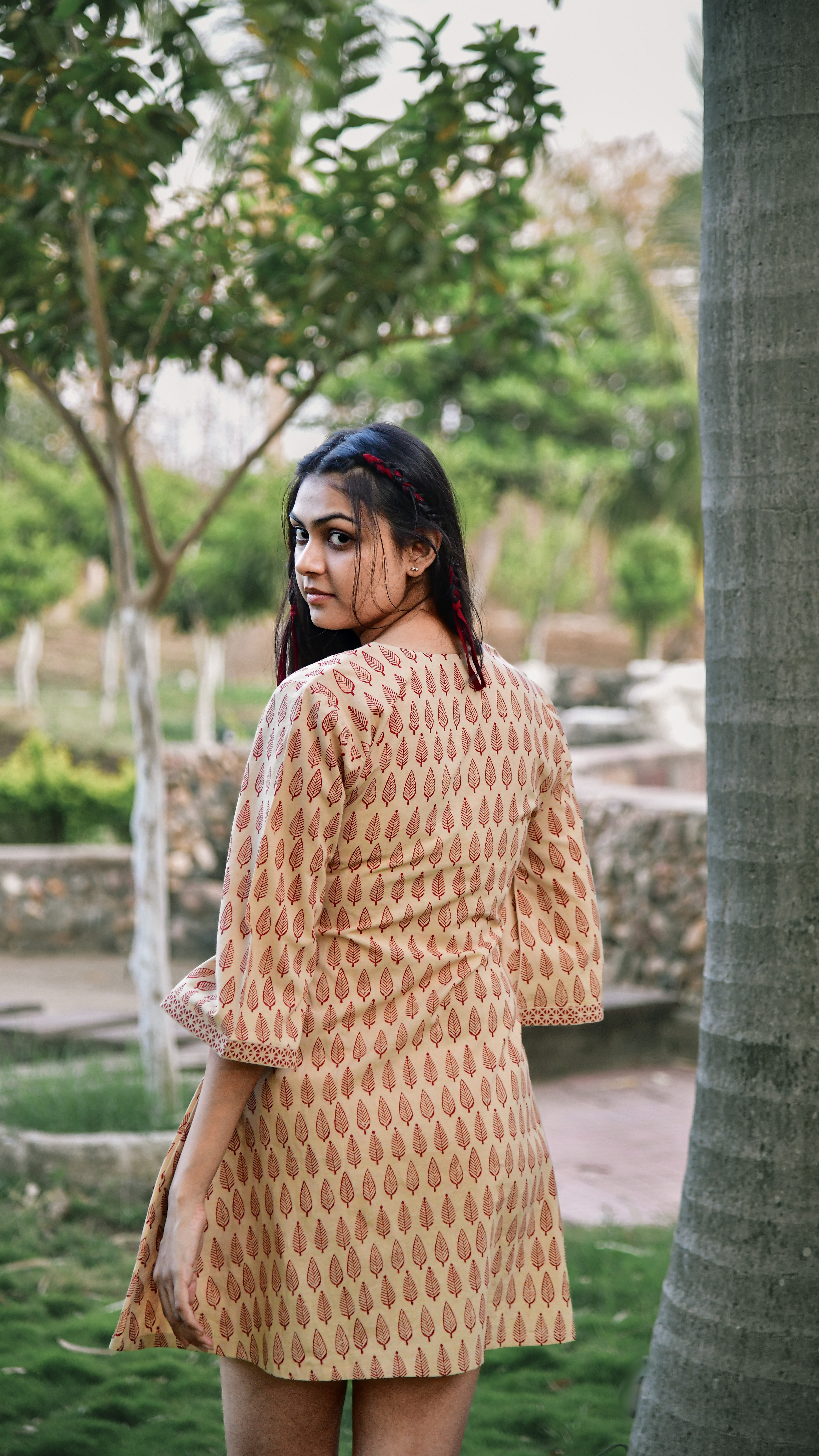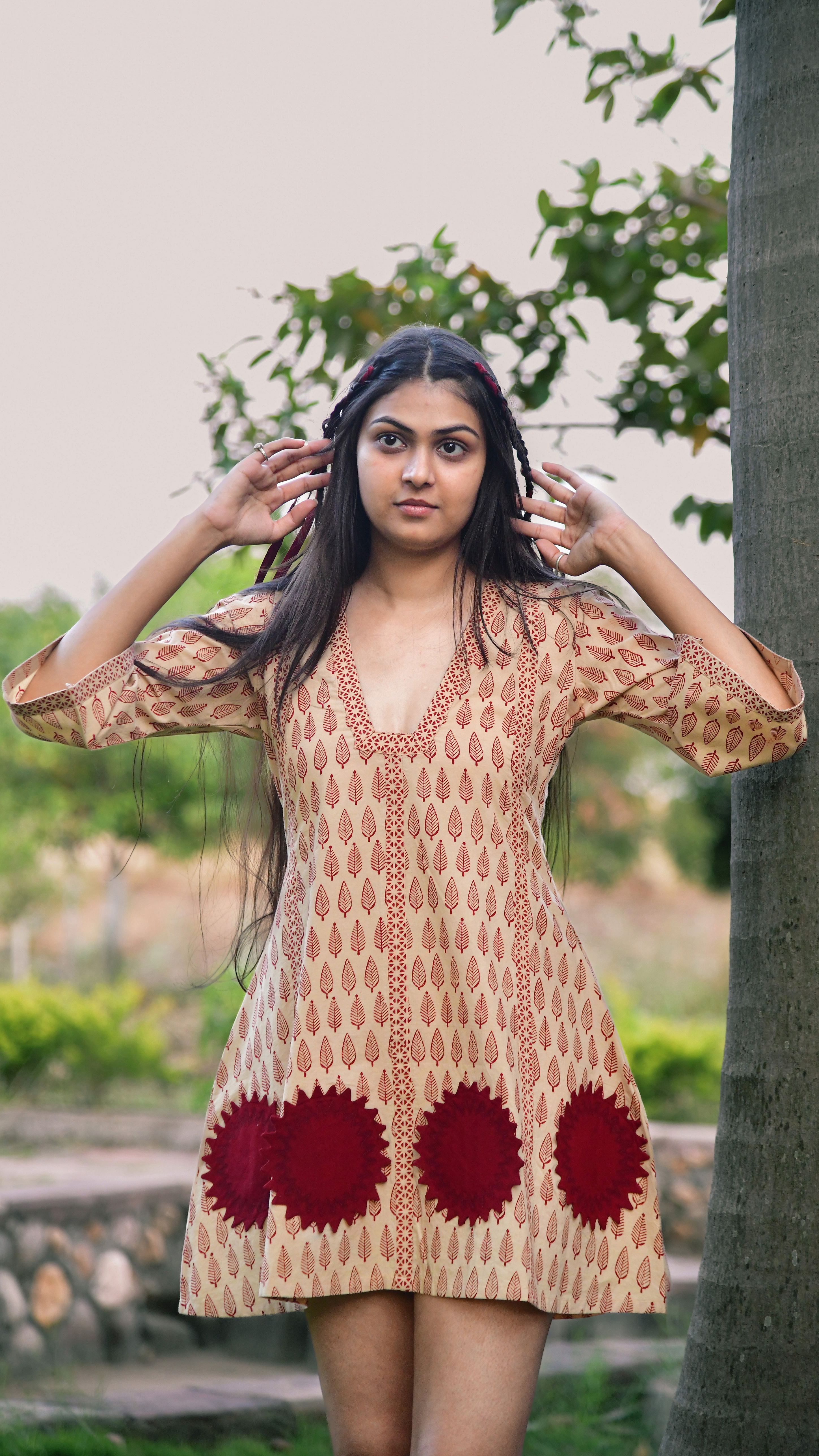 This breezy cotton mini blends a playful silhouette with timeless Indian craftsmanship. Its soft, neutral base is adorned with delicate leaf motifs and bold sunburst circles in deep red. A gently flared cut and a flattering V-neck ensure both comfort and style, making it a versatile choice for any casual outing or relaxed gathering.