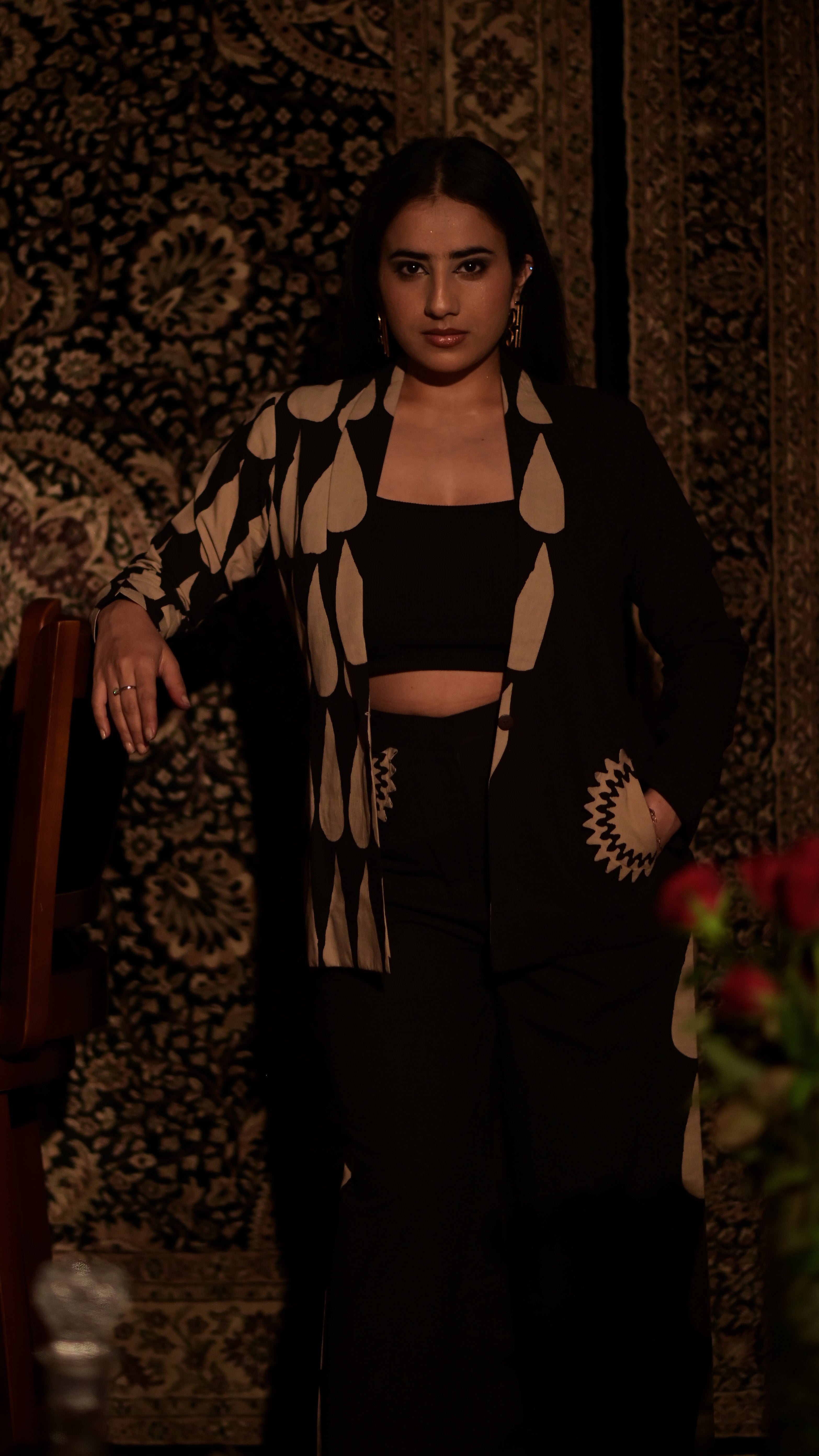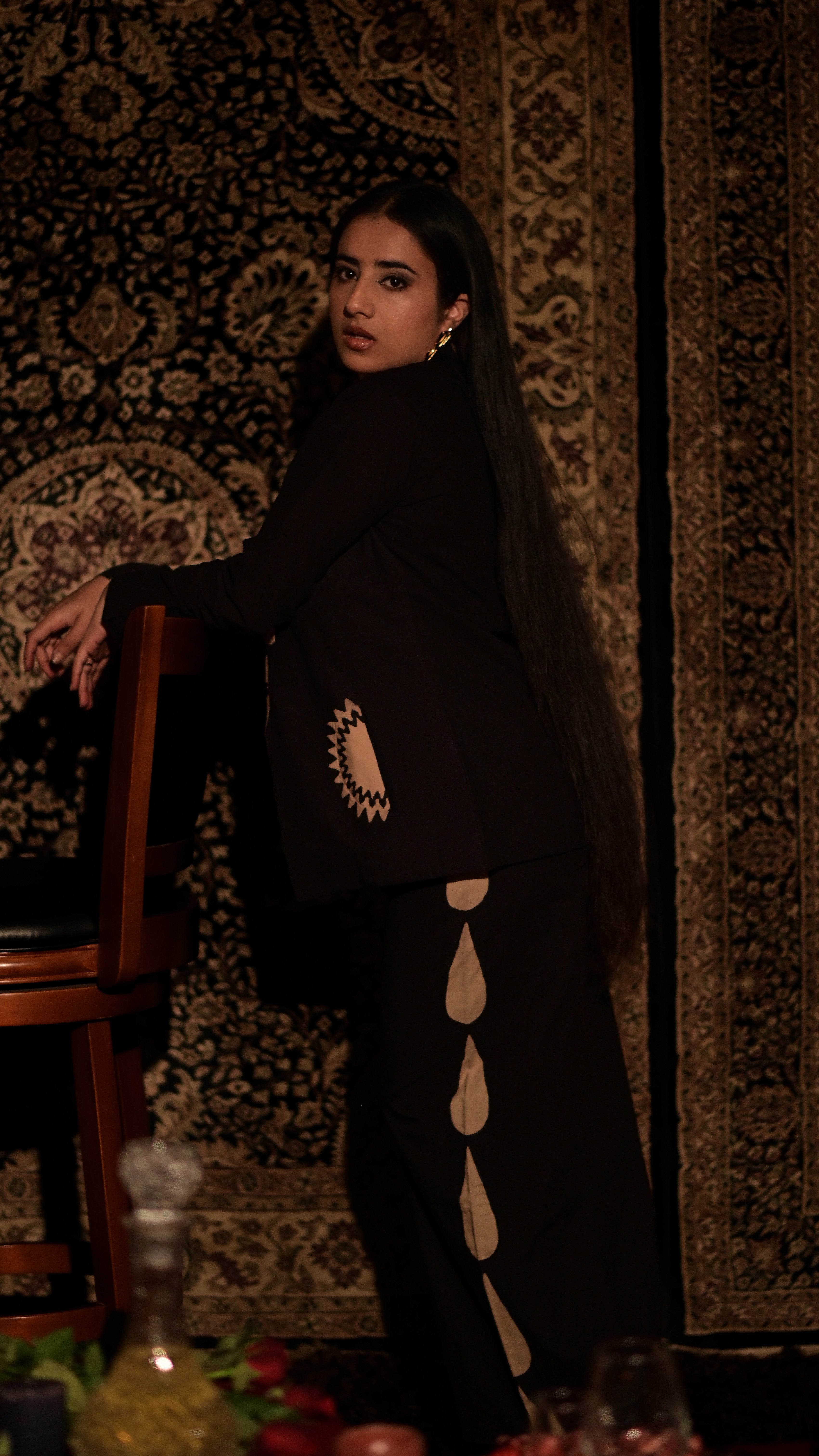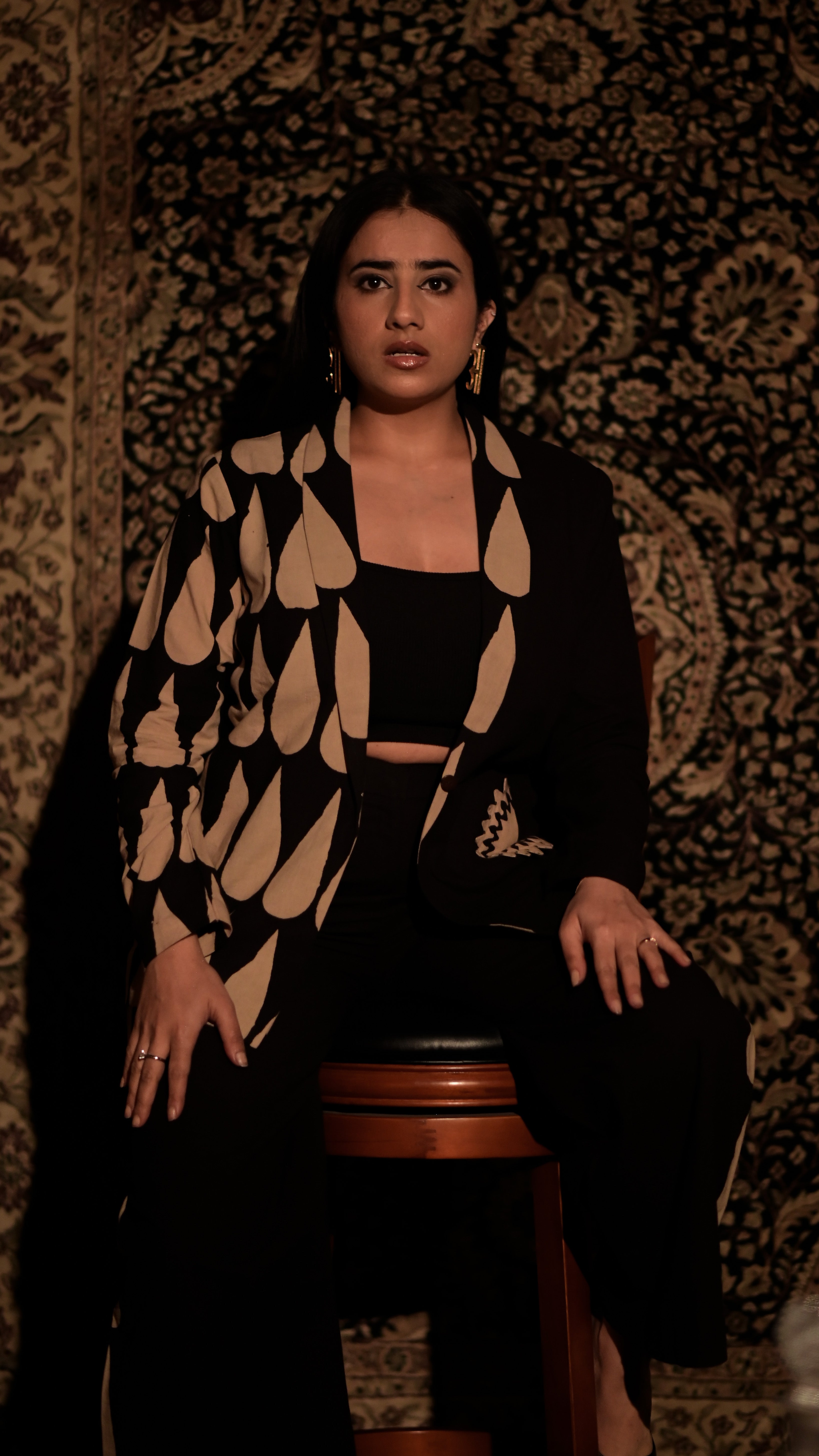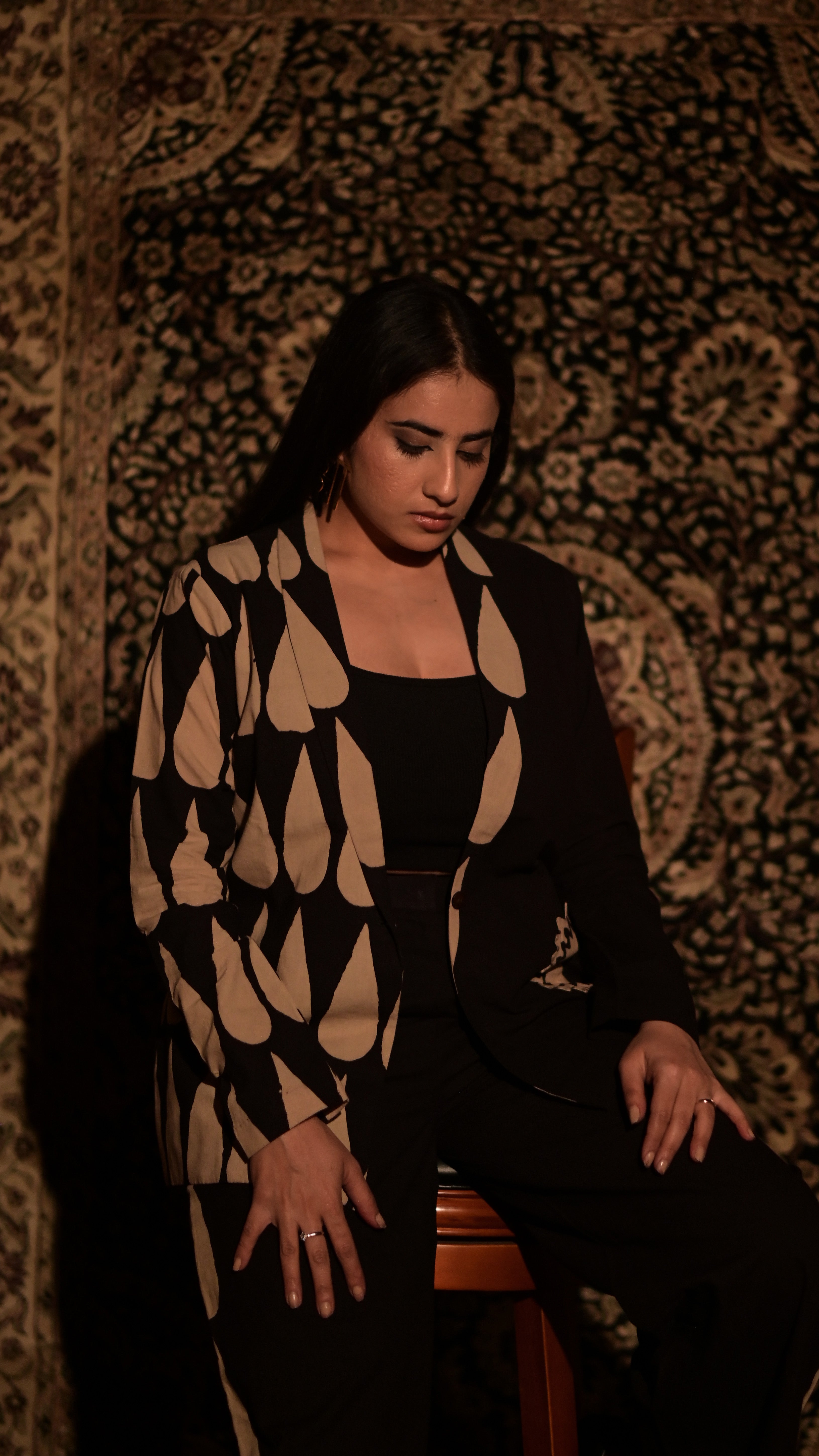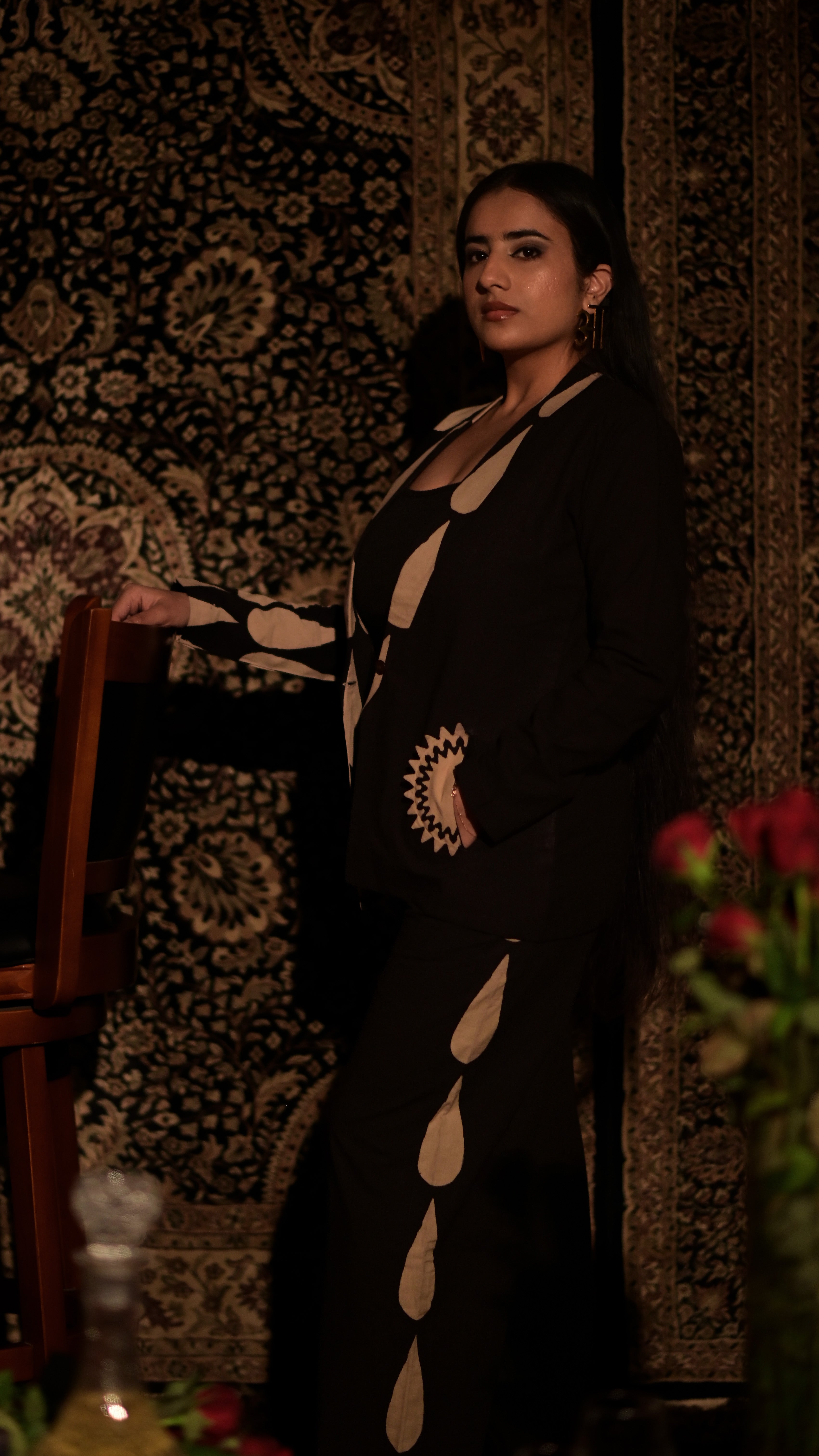 Commanding yet effortlessly fluid, this pant suit is adorned with our signature Boond print, a rhythmic play of bold teardrop motifs. The structured blazer drapes with confidence, perfectly complementing the sleek, tailored trousers. Accentuated with sunburst detailing, where tradition meets modernity in striking contrast.