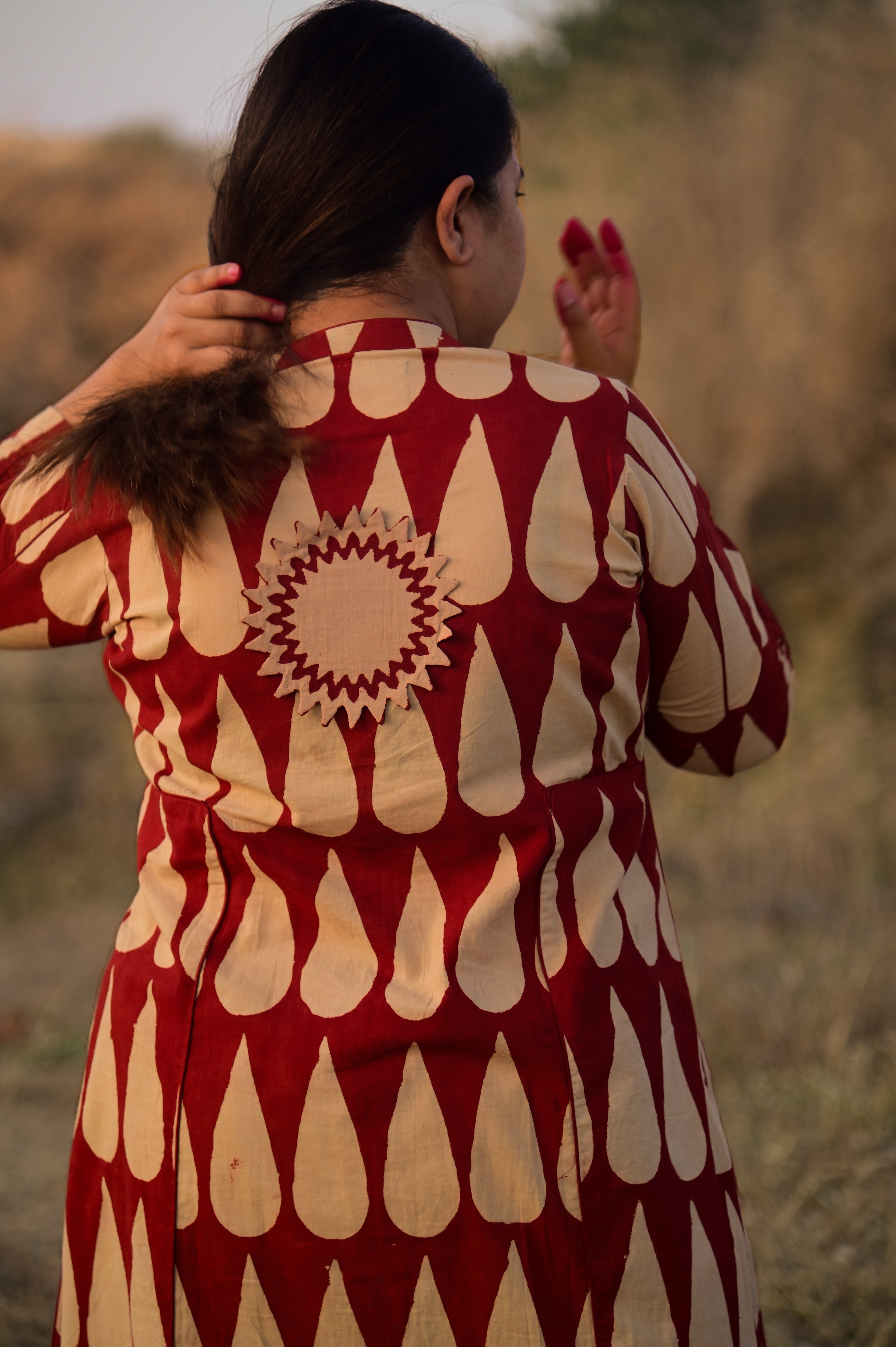 Drenched in earthy charm, this co-ord set features our signature Boond print in a striking red and beige palette. The long, flowy kurta with a structured collar and three-quarter sleeves brings a touch of vintage elegance, while the wide-legged pants ensure comfort and effortless movement.