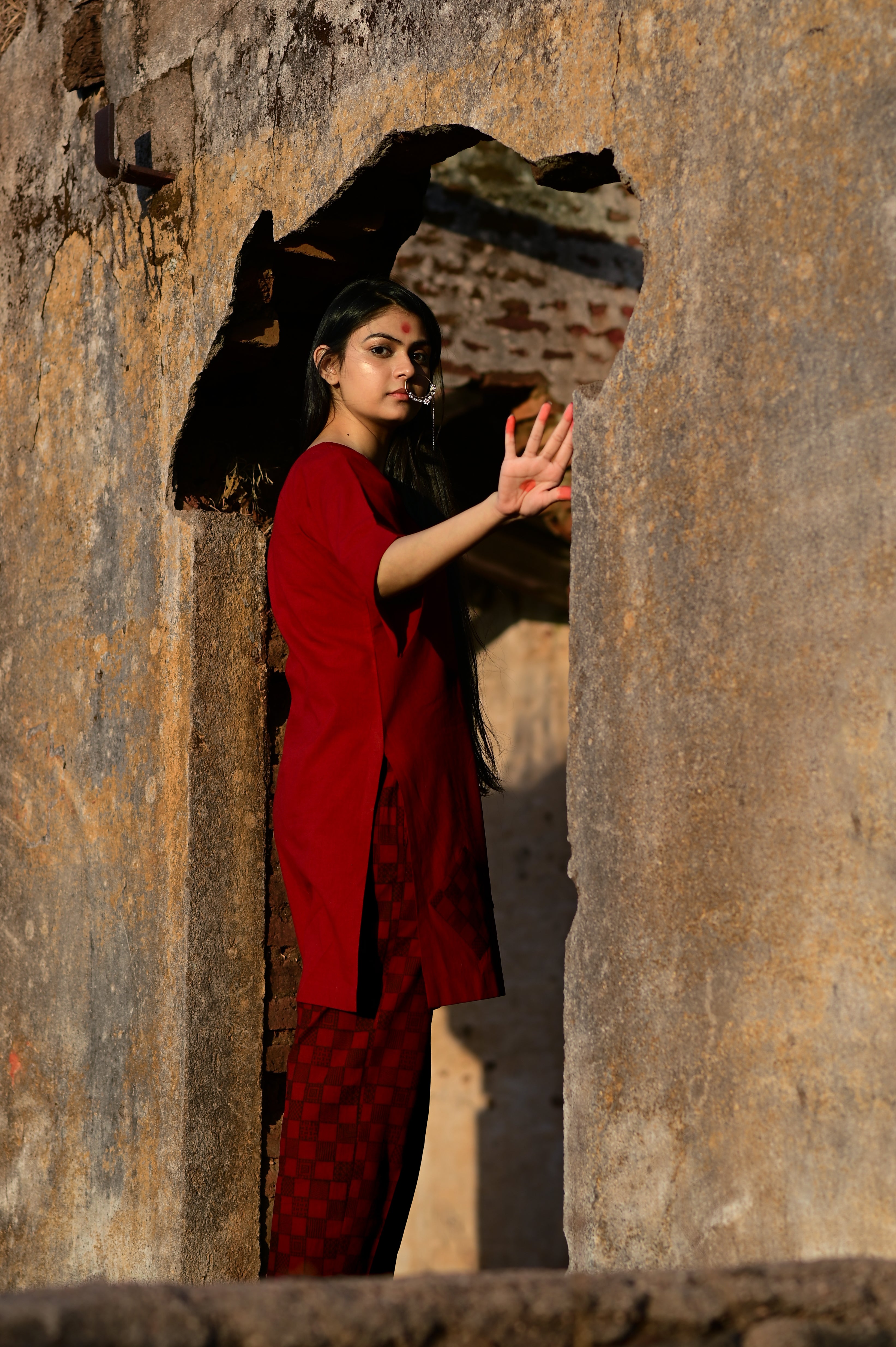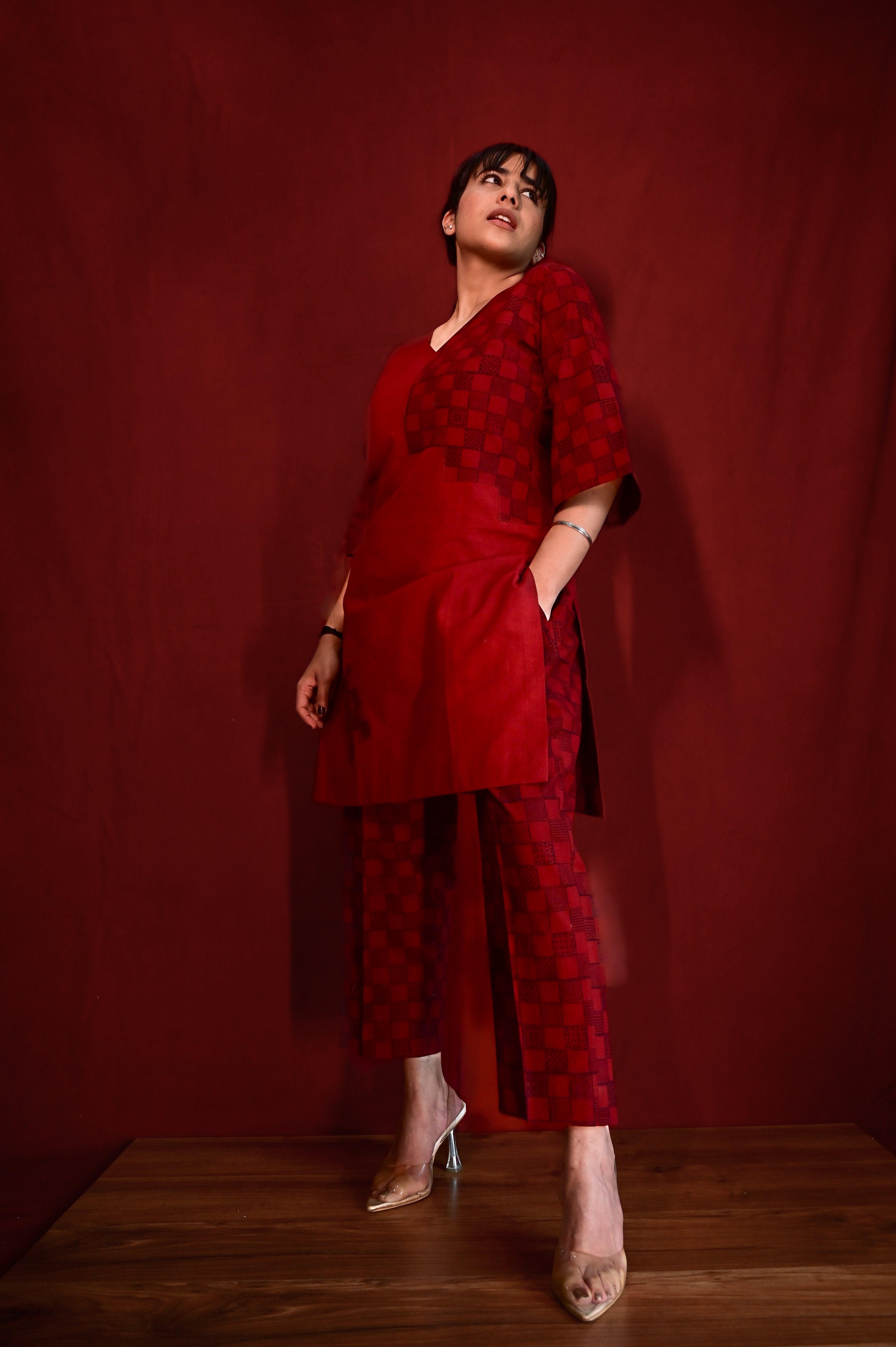 A perfect blend of tradition and modern ease, this co-ord set features a deep red hue adorned with a subtle tone-on-tone geometric print. The relaxed V-neck kurta, with its wide half sleeves, drapes effortlessly. Paired with cropped straight-leg pants in a matching print.