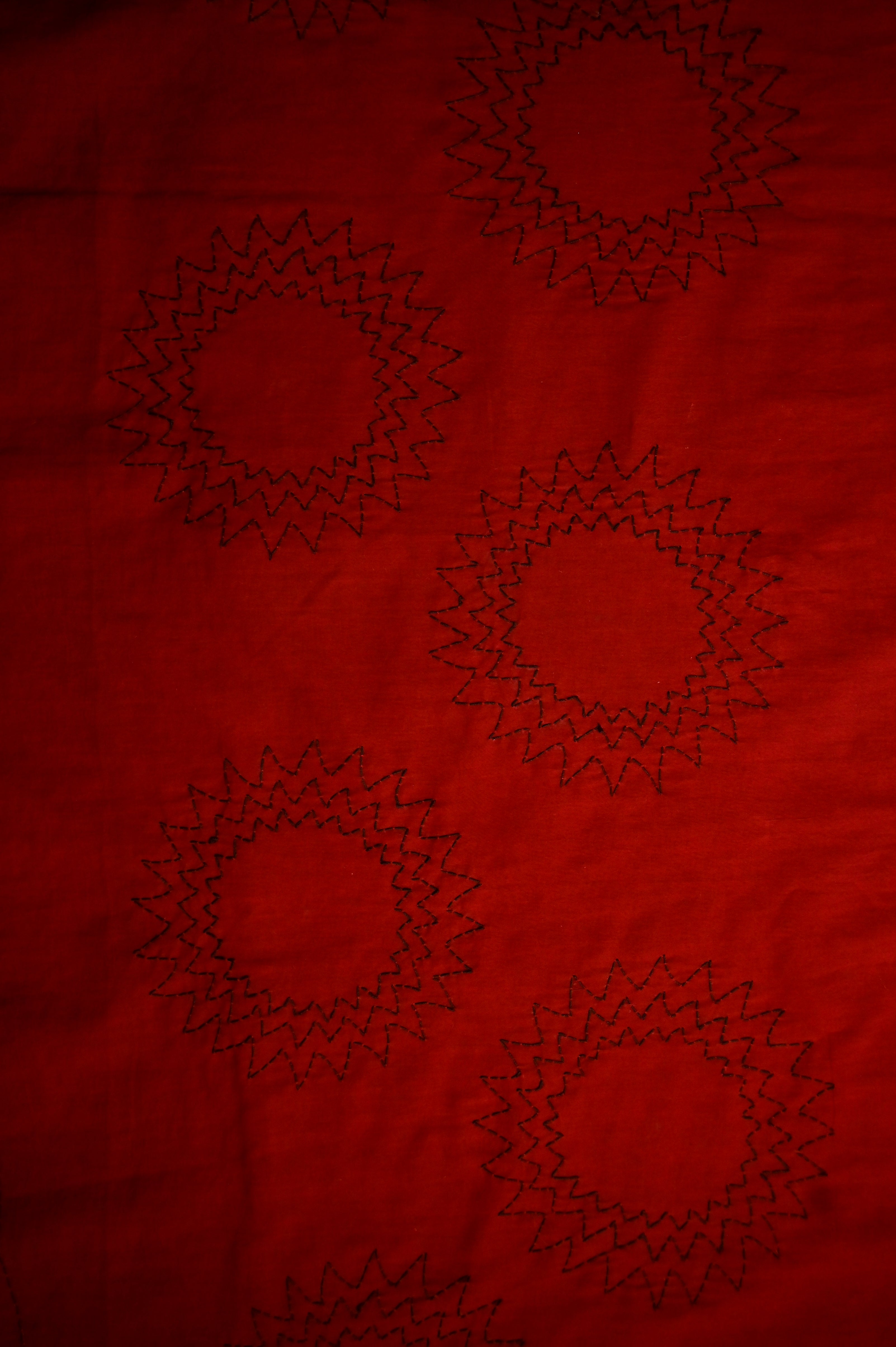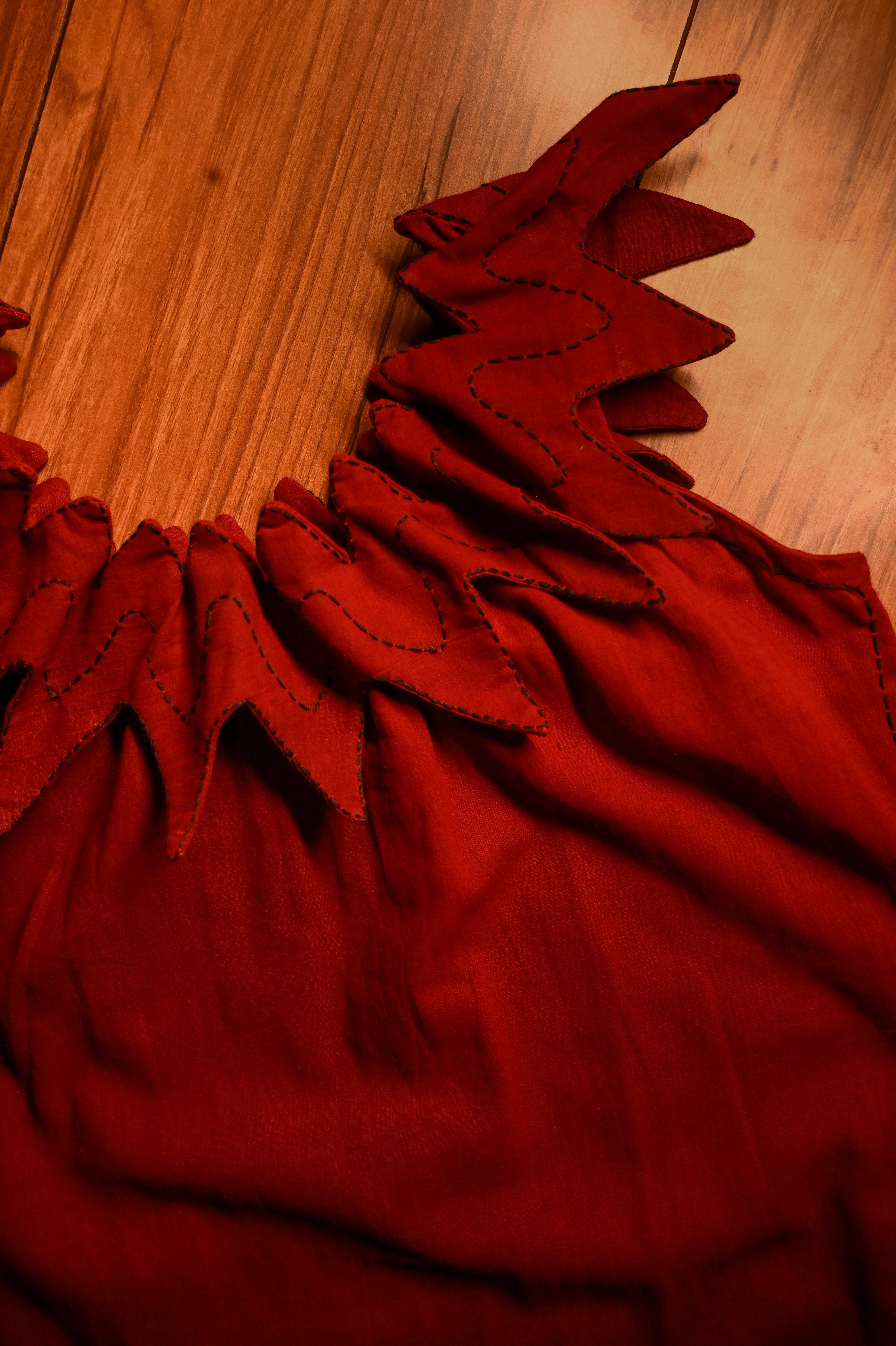 A deep maroon maxi dress adorned with intricate kantha-stitched signature motifs along the hem. The neckline features delicate cutwork in the shape of our signature sun, adding a celestial touch to this timeless silhouette.