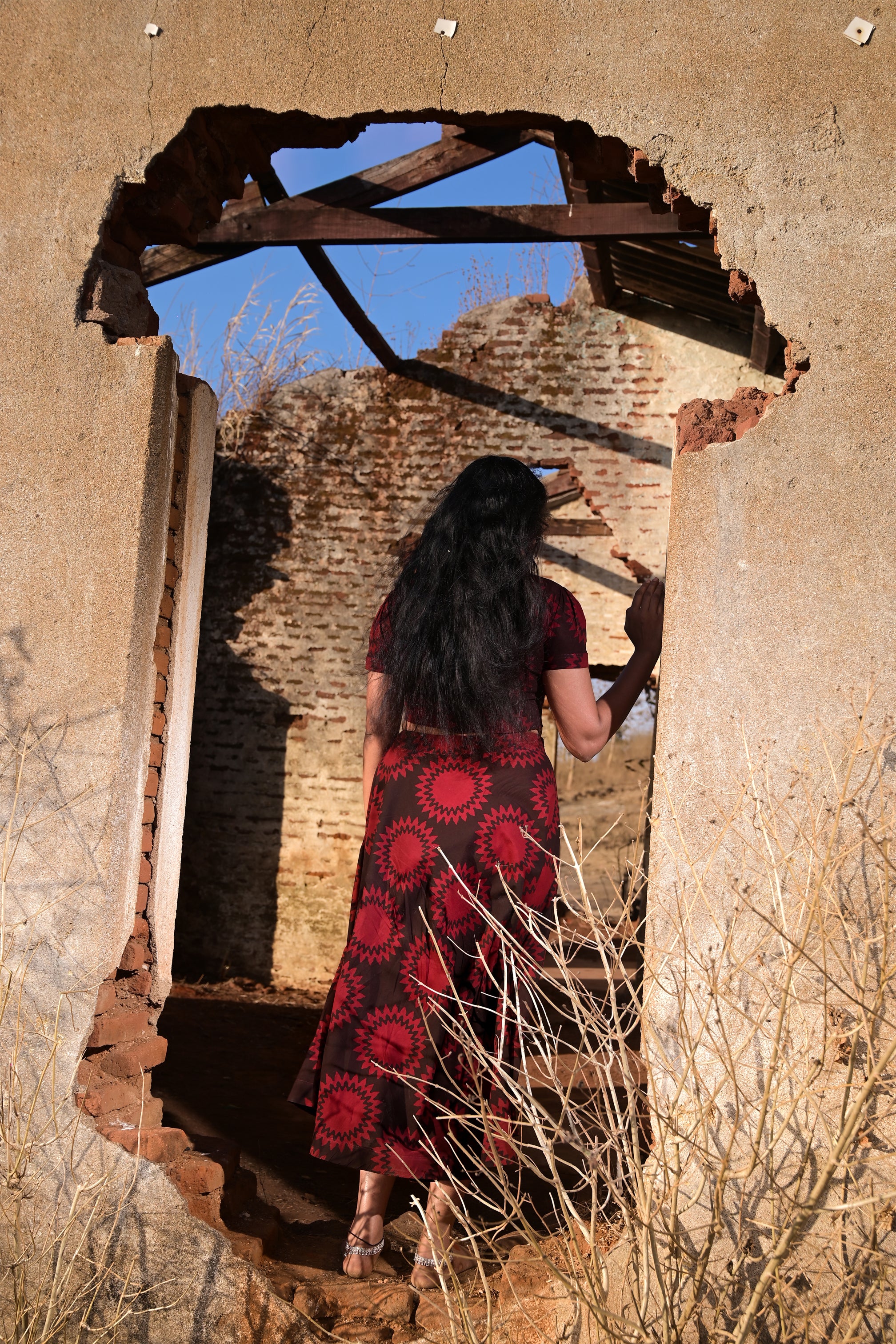 The deep red midi skirt features a mesmerising sunburst print in a rich contrast of red and black, radiating power and warmth. Paired with a cropped blouse that fits snugly. The short sleeves and high-waisted skirt create a timeless silhouette, while the intricate sunburst motifs add a touch of vintage allure.
