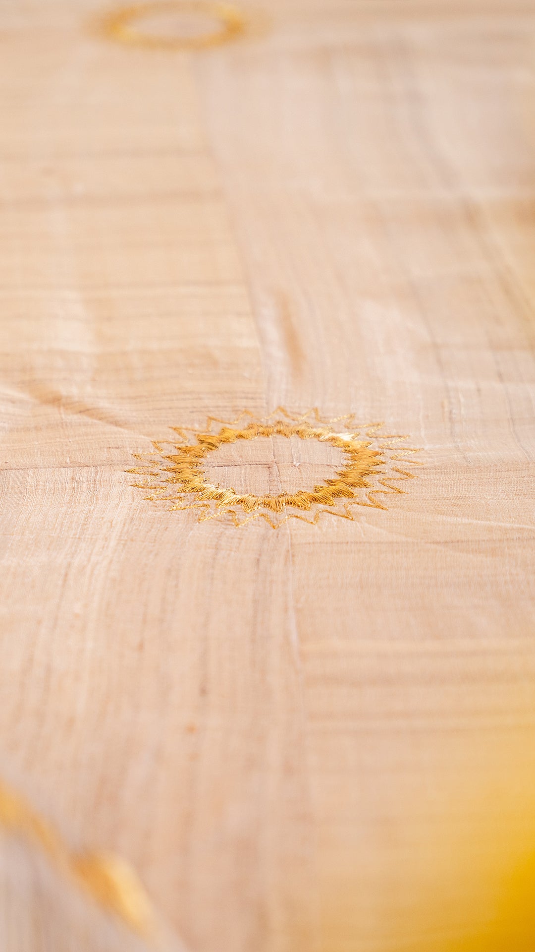 Woven from peace silk, this bedcover tells a story of light and unity. Each panel represents a facet of life, unique yet connected. At every intersection, a gold zari Sun is placed, symbolizing the eternal presence of light at the meeting point of all paths. It is a map of becoming, where softness meets strength and stillness holds radiance. The pillow covers in its own way frame this cosmic net, like guardians of a quiet sunlit realm.