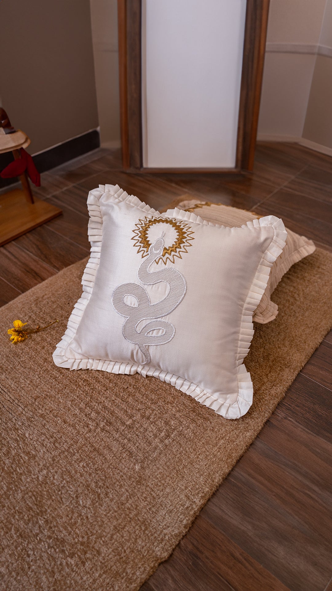 The Sun and the Serpent cushion embodies the ancient dance of power, transformation and enlightenment. The golden Sun represents the ultimate source of life and divine consciousness, while the white serpent, winding its way upward, symbolises ascension, wisdom and the primal life force.